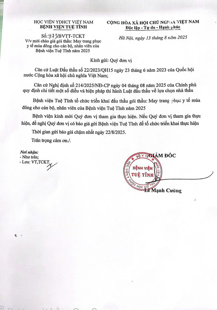Bệnh viện Tuệ Tĩnh tổ chức triển khai đấu thầu gói thầu: May trang phục y tế mùa đông cho cán bộ, nhân viên của Bệnh viện năm 2025. Bệnh viện kính mòi Quý đơn vị tham gia thực hiện. Nếu Quý đơn vị tham gia thực hiện, đề nghị Quý đơn vị có báo giá gửi Bệnh viện Tuệ TĨnh để tổ chức triển khai thực hiện. Thời gian báo giá chậm nhất ngày 22/8/2025