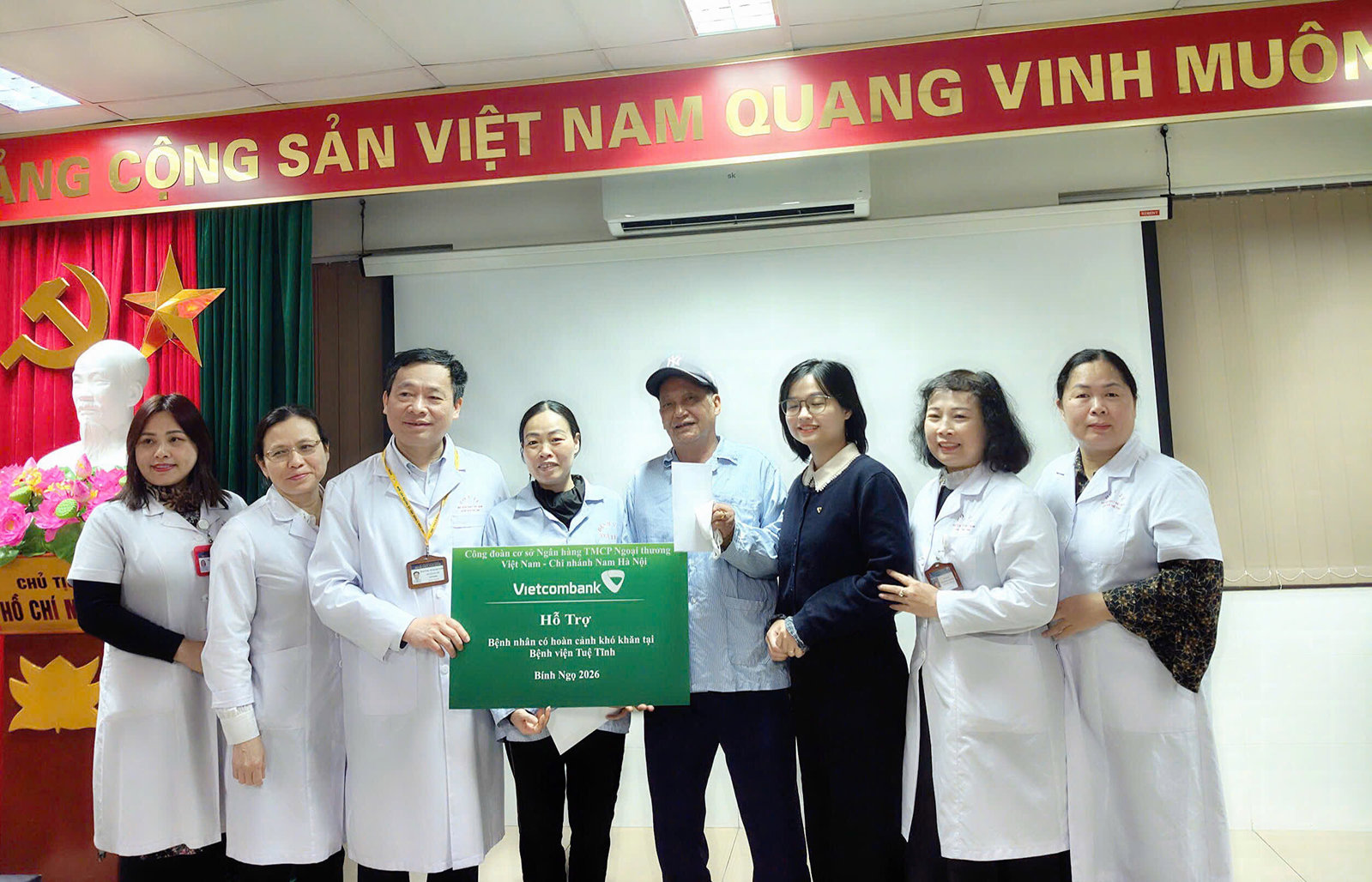 Dịp Tết Nguyên đán 2026, Công đoàn cơ sở Vietcombank Chi nhánh Nam Hà Nội đã phối hợp chặt chẽ với Ban Lãnh đạo Bệnh viện Tuệ Tĩnh tổ chức chương trình thăm hỏi, hỗ trợ và trao quà cho các bệnh nhân có hoàn cảnh khó khăn đang điều trị tại bệnh viện. Chương trình được triển khai trên tinh thần sẻ chia, nhân ái, hướng tới mục tiêu chăm lo cả về vật chất lẫn tinh thần cho người bệnh trong những ngày Tết cổ truyền của dân tộc.