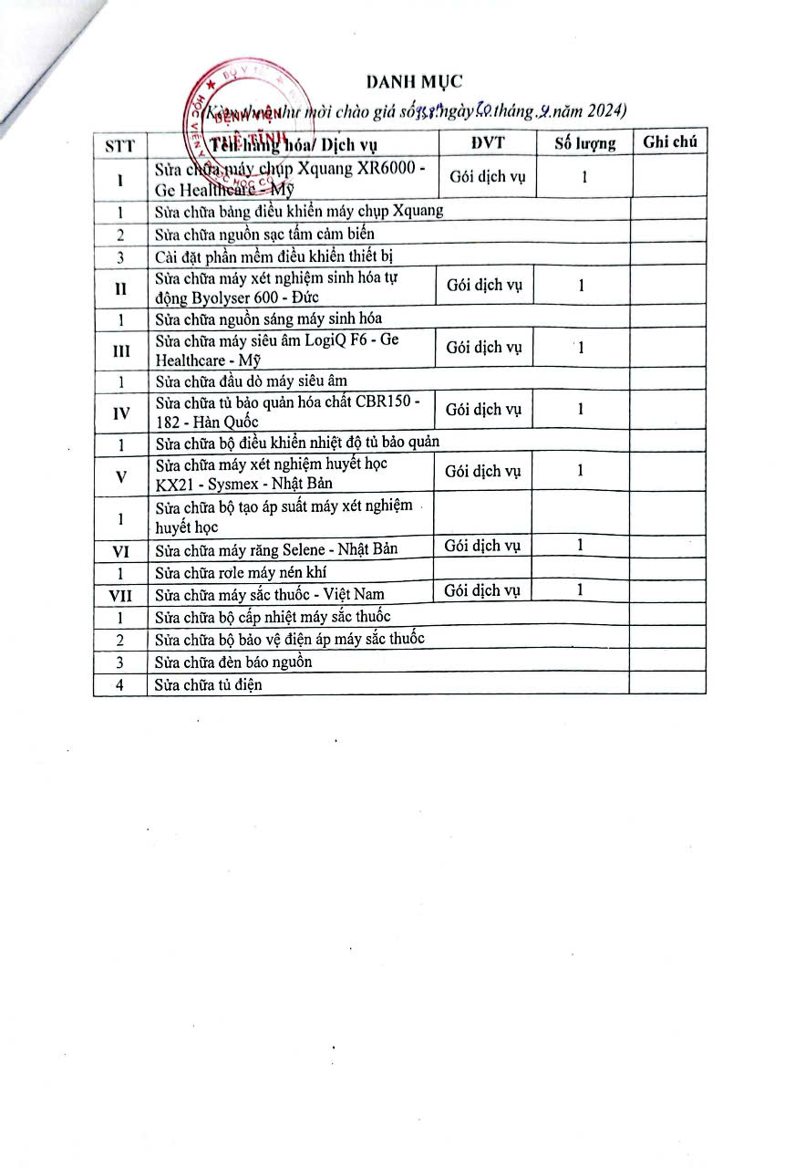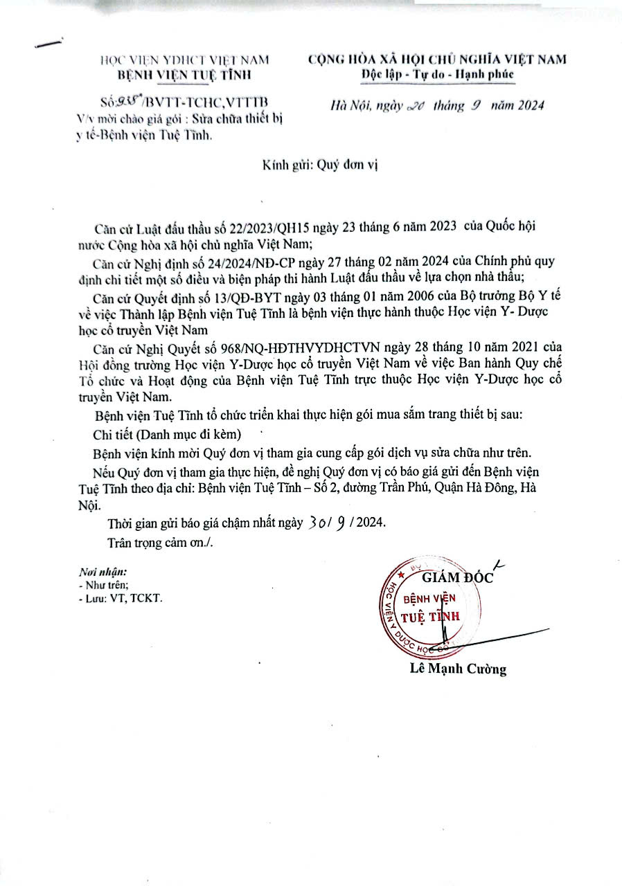 Thư chào giá sửa chữa thiết bị y tế các khoa phòng bệnh viện Tuệ Tĩnh